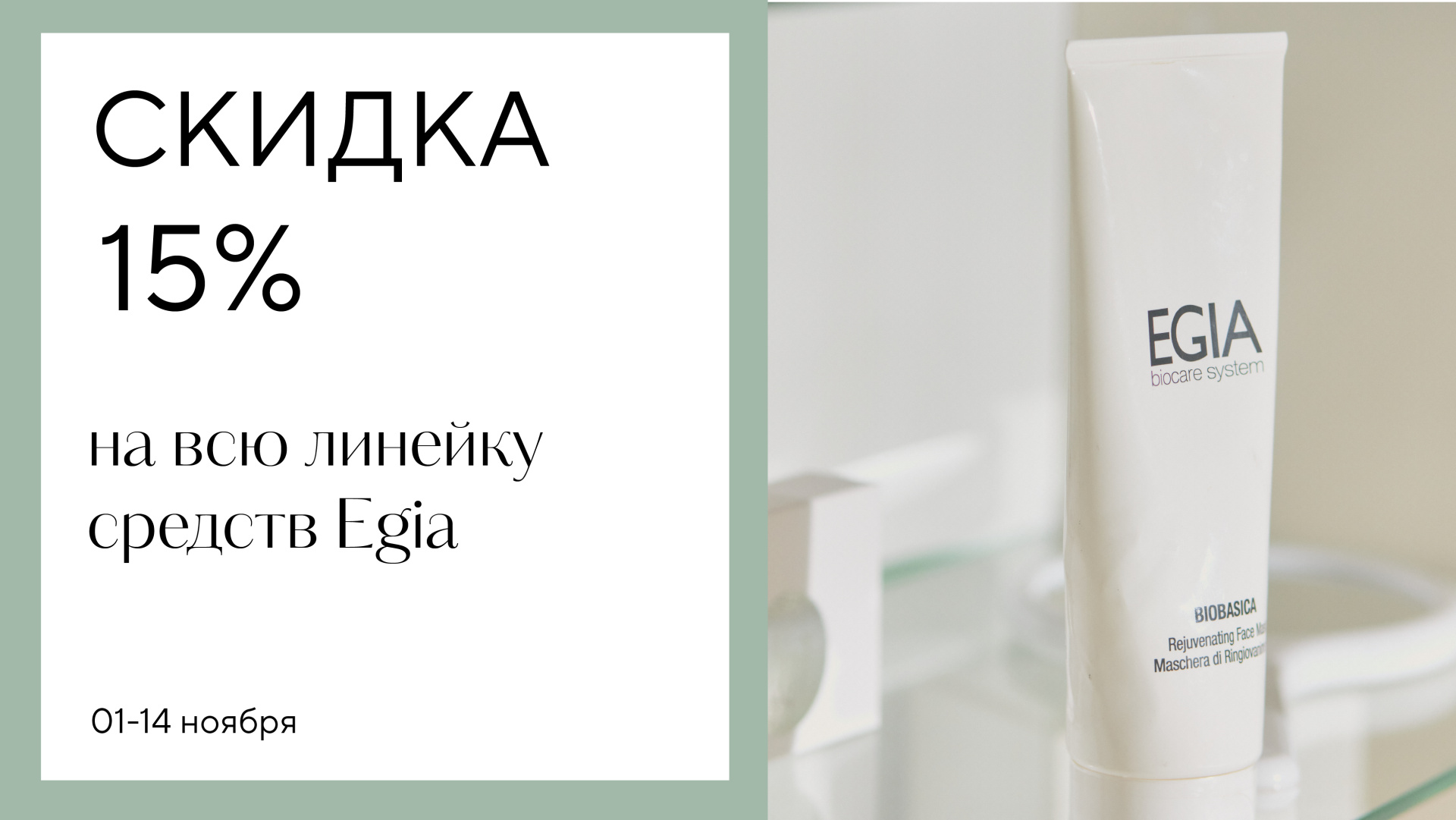 С 1 по 14 ноября — скидка на всю линейку средств Egia — профессиональную уходовую косметику из Италии.;
