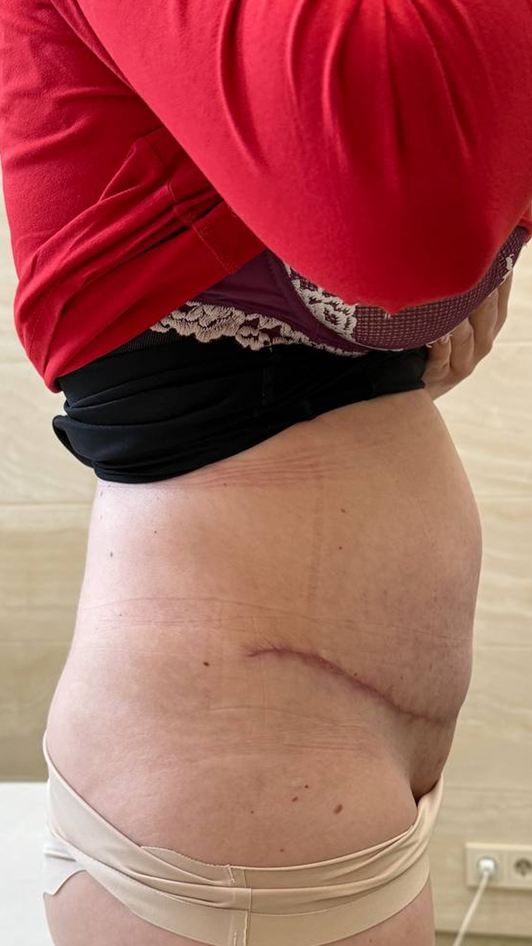- Носите компрессионное бельё (специальный поддерживающий пояс, компрессионный корсет) в течение 1–2 месяцев круглосуточно. Оно помогает уменьшить отёки, предотвращает расхождение швов и образование гематом, а также поддерживает ткани в правильном положении, способствуя быстрому и комфортному заживлению.