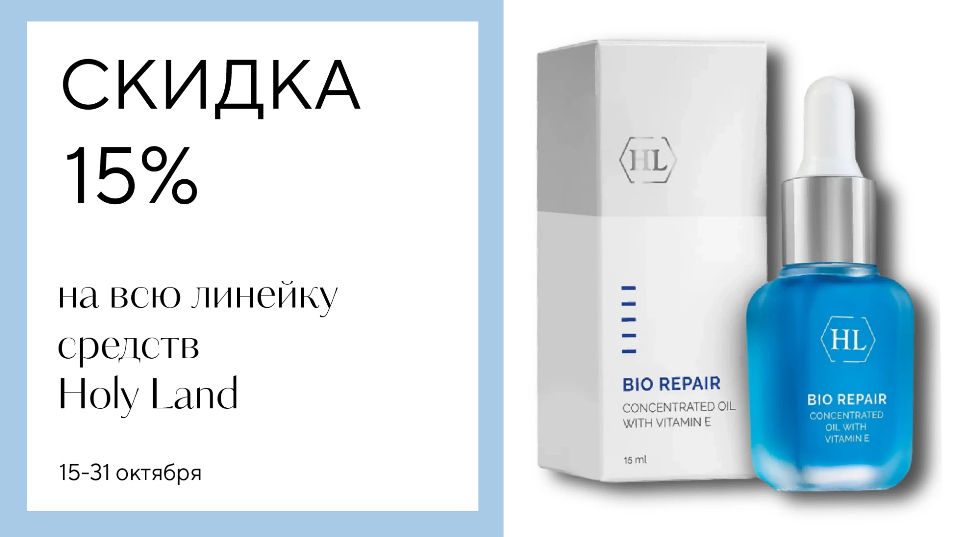 С 15 по 31 октября — скидка 15% на всю линейку средств Holy Land — лаборатории израильской профессиональной косметики для решения различных проблем кожи и эстетической медицины.